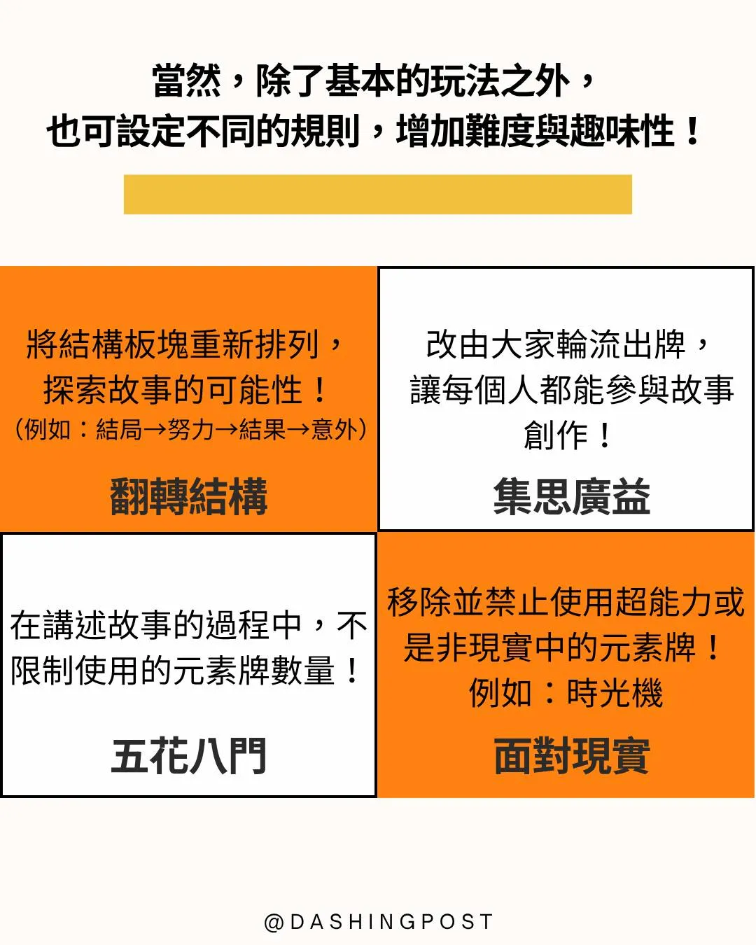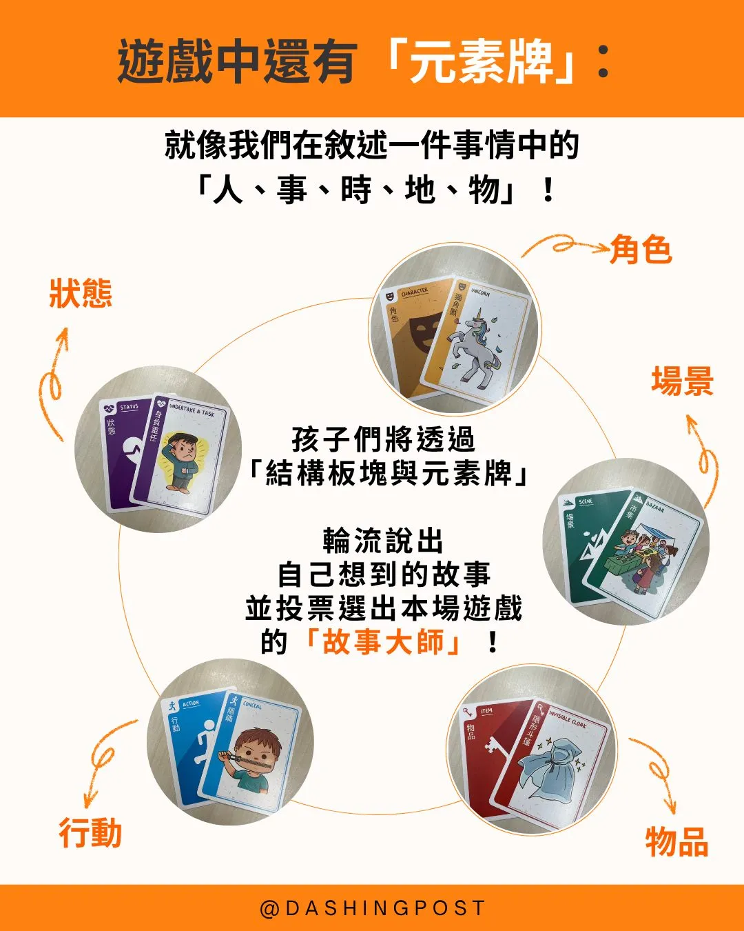 孩子們將透過「結構板塊與元素牌」輪流說出自己想到的故事,並投票選出本場遊戲的 「故事大師」!